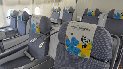 “歡迎乘坐中國南方航空公司CZ8887‘攜手南航 飛向美好未來’主題航班!憋w機客艙內(nèi),行李架、壁板及全艙座椅頭巾裝飾都采用了進博會的設(shè)計元素——熊貓“進寶”手持的四葉草象征幸福與幸運,寓意著中國給世界各國人民的美好祝福。