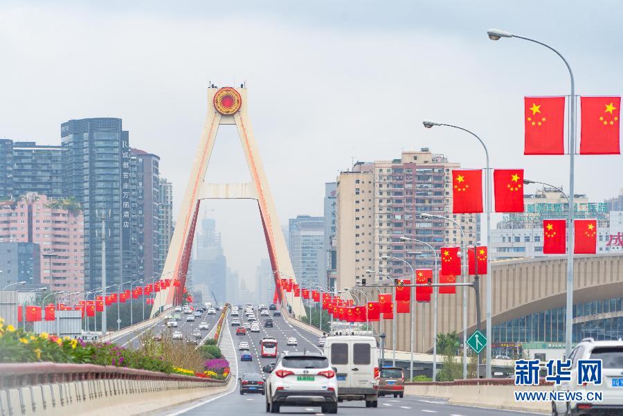 9月26日,成都市天府立交橋上掛滿國旗,迎接國慶節(jié)的到來。 新華社發(fā)(張可凡攝)