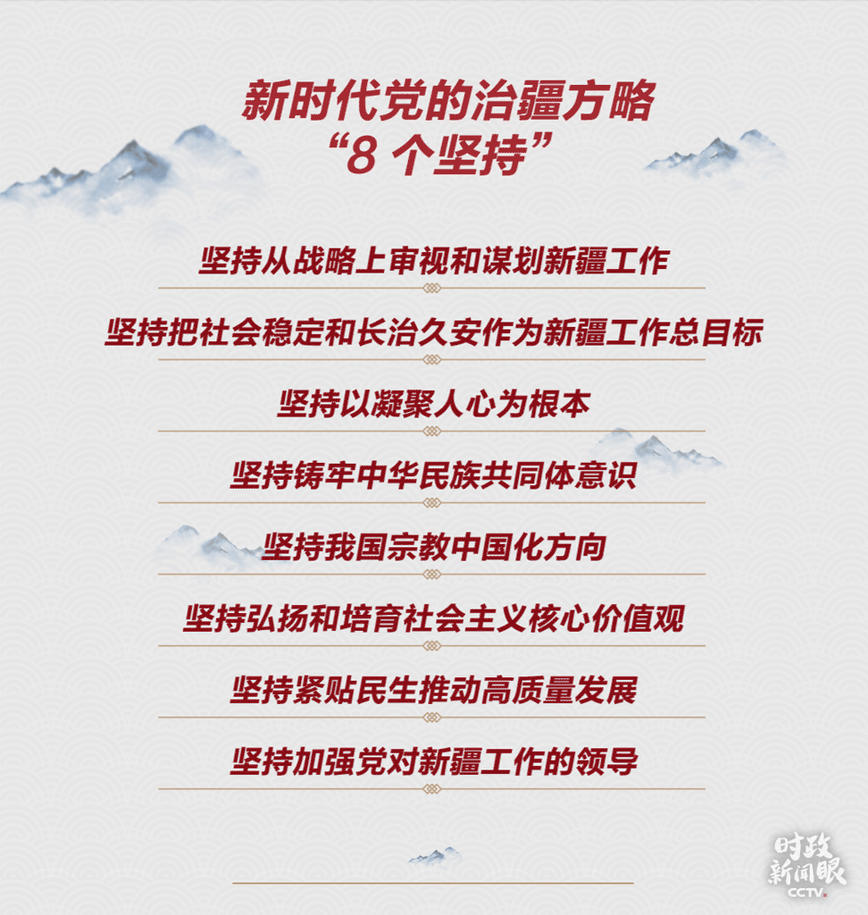 就在此次座談會一個月前,總書記在中央第七次西藏工作座談會上以“10個必須”概括了新時代黨的治藏方略,其中寫入了總書記多次談到的戰(zhàn)略思想:“治國必治邊、治邊先穩(wěn)藏”。而在新時代黨的治疆方略中,也重申了多次強調的新疆工作總目標:“社會穩(wěn)定、長治久安”。