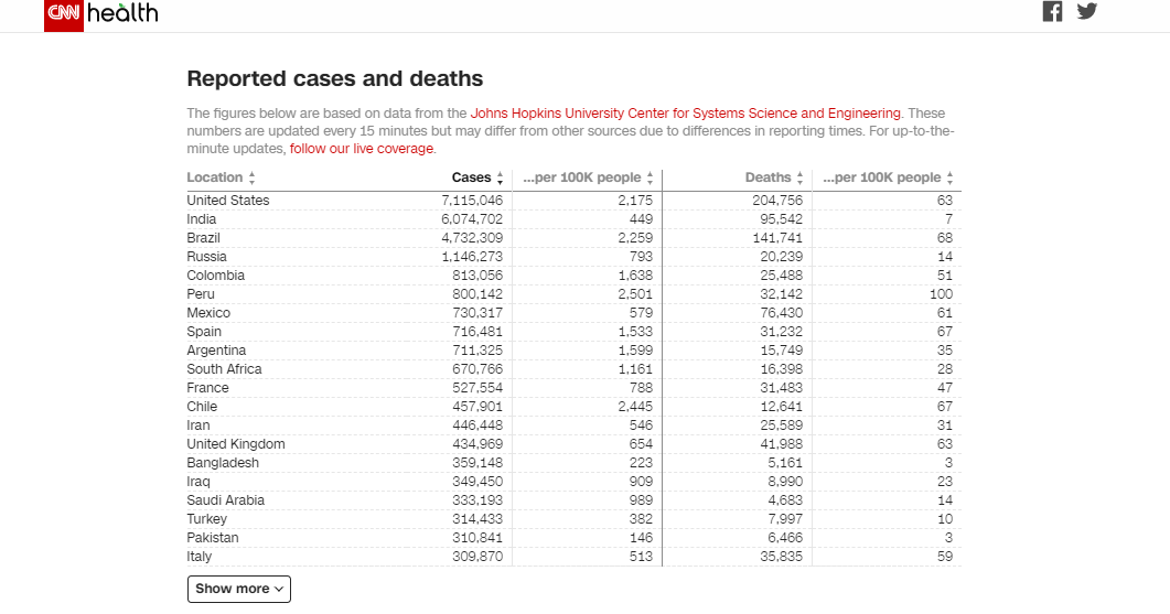△CNN報道顯示,美國無論是新冠肺炎確診病例數(shù)還是死亡人數(shù),都高居世界榜首。