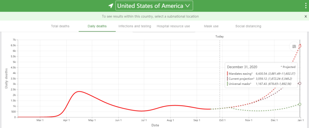 華盛頓大學(xué)衛(wèi)生指標(biāo)與評估研究所所長克里斯·莫里也警告,隨著秋冬季節(jié)到來,美國病例數(shù)可能激增。該研究所預(yù)測,在現(xiàn)行防疫標(biāo)準(zhǔn)下,美國新冠肺炎日死亡人數(shù)將從目前的約780人驟增到12月下旬的3000人左右。而如果進(jìn)一步放寬管控措施,日死亡人數(shù)將超過6000人。