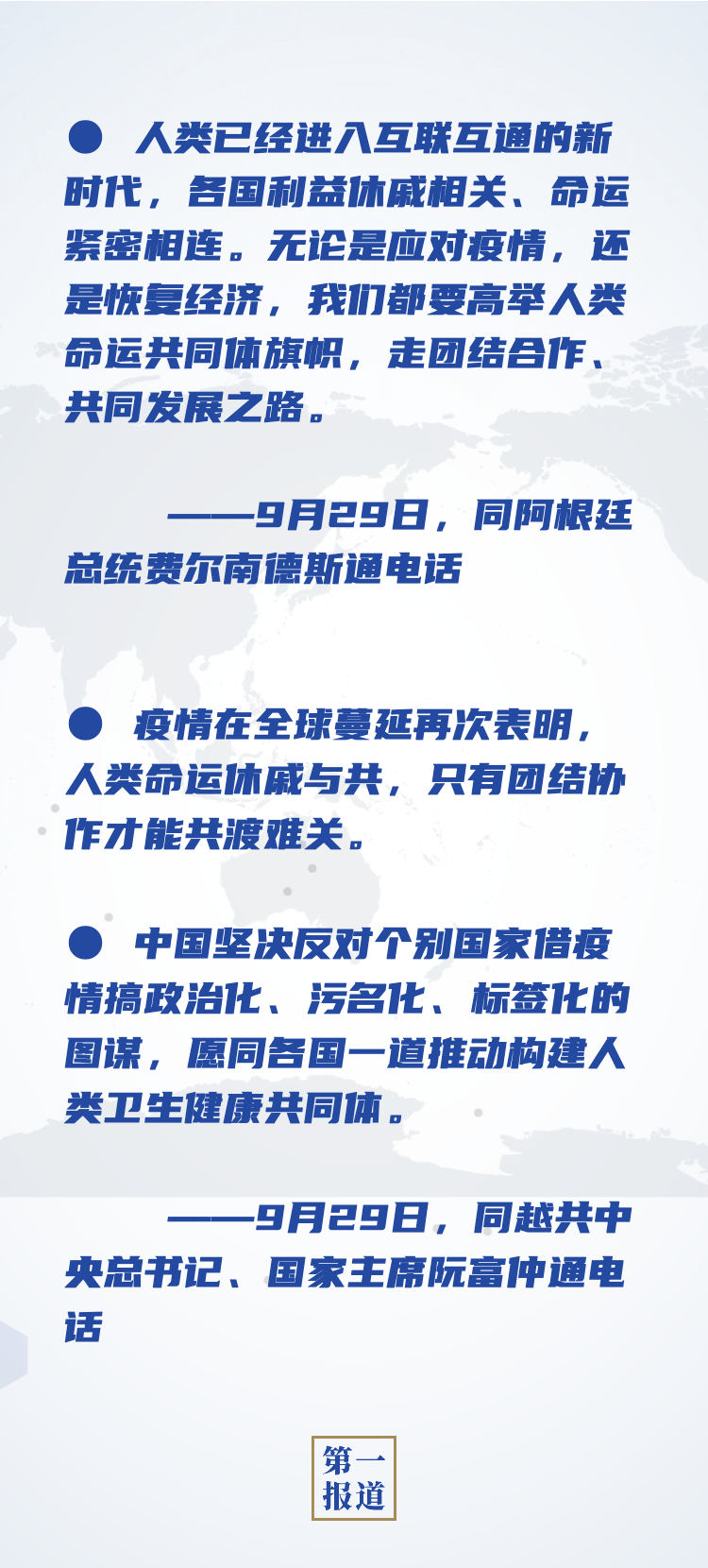 “團(tuán)結(jié)合作是最有力的武器”“唯有相互支持、團(tuán)結(jié)合作才是戰(zhàn)勝危機(jī)的人間正道”……今年以來,面對疫情挑戰(zhàn),習(xí)主席在各種雙多邊場合反復(fù)提到“團(tuán)結(jié)”一詞,號召世界各國團(tuán)結(jié)合作、共克時艱。9月22日,在第七十五屆聯(lián)合國大會一般性辯論上發(fā)表重要講話時,習(xí)主席面向國際社會發(fā)出“讓我們團(tuán)結(jié)起來”的真誠呼吁。29日,在習(xí)主席同阿根廷、越南領(lǐng)導(dǎo)人的通話中,“團(tuán)結(jié)”這一中國外交高頻詞再次出現(xiàn):