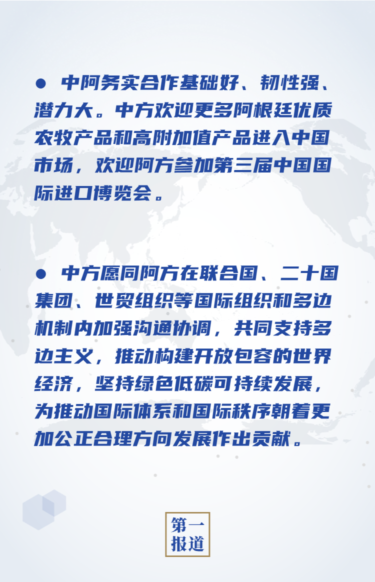 習(xí)近平強(qiáng)調(diào),中方高度重視同阿根廷的關(guān)系,支持阿方發(fā)展經(jīng)濟(jì)、改善民生,對中阿合作未來充滿信心。中國將全面提高對外開放水平,推動形成以國內(nèi)大循環(huán)為主體、國內(nèi)國際雙循環(huán)相互促進(jìn)的新發(fā)展格局。這將為包括阿根廷在內(nèi)的世界各國提供廣闊市場和發(fā)展機(jī)會。中阿務(wù)實(shí)合作基礎(chǔ)好、韌性強(qiáng)、潛力大。中方歡迎更多阿根廷優(yōu)質(zhì)農(nóng)牧產(chǎn)品和高附加值產(chǎn)品進(jìn)入中國市場,歡迎阿方參加第三屆中國國際進(jìn)口博覽會。雙方應(yīng)落實(shí)好現(xiàn)有重大項(xiàng)目,開辟合作新疆域,深化人文交流,推動中阿全面戰(zhàn)略伙伴關(guān)系取得更大發(fā)展。