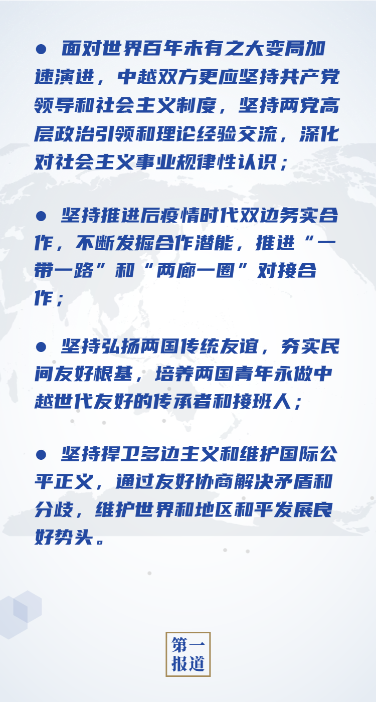 習(xí)近平強(qiáng)調(diào),中國和越南山水相連,兩國在意識形態(tài)、發(fā)展道路、社會制度、價值理念等方面高度一致,把雙邊關(guān)系發(fā)展好符合兩國和兩國人民根本利益。今年是中越建交70周年,兩黨兩國關(guān)系邁上新的歷史起點(diǎn)。疫情之下中越雙邊貿(mào)易等合作呈現(xiàn)出強(qiáng)勁增長勢頭,彰顯了中越關(guān)系的韌性和潛力。面對世界百年未有之大變局加速演進(jìn),中越雙方更應(yīng)堅(jiān)持共產(chǎn)黨領(lǐng)導(dǎo)和社會主義制度,堅(jiān)持兩黨高層政治引領(lǐng)和理論經(jīng)驗(yàn)交流,深化對社會主義事業(yè)規(guī)律性認(rèn)識;堅(jiān)持推進(jìn)后疫情時代雙邊務(wù)實(shí)合作,不斷發(fā)掘合作潛能,推進(jìn)“一帶一路”和“兩廊一圈”對接合作;堅(jiān)持弘揚(yáng)兩國傳統(tǒng)友誼,夯實(shí)民間友好根基,培養(yǎng)兩國青年永做中越世代友好的傳承者和接班人;堅(jiān)持捍衛(wèi)多邊主義和維護(hù)國際公平正義,通過友好協(xié)商解決矛盾和分歧,維護(hù)世界和地區(qū)和平發(fā)展良好勢頭。中國共產(chǎn)黨支持越南共產(chǎn)黨開好十三大,愿繼續(xù)為越南社會主義建設(shè)事業(yè)提供力所能及的支持和幫助。