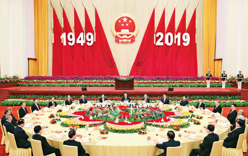 2019年9月30日晚,慶祝中華人民共和國成立70周年招待會(huì)在北京人民大會(huì)堂隆重舉行。習(xí)近平、李克強(qiáng)、栗戰(zhàn)書、汪洋、王滬寧、趙樂際、韓正、王岐山等黨和國家領(lǐng)導(dǎo)人與4000余名中外人士歡聚一堂,共慶新中國70華誕。 新華社記者 黃敬文/攝