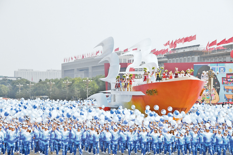 2019年10月1日上午,慶祝中華人民共和國成立70周年大會在北京天安門廣場隆重舉行。這是群眾游行中的“揚(yáng)帆遠(yuǎn)航”方陣。 新華社記者 李欣/攝