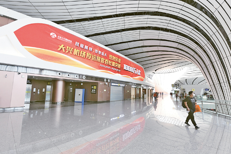2019年9月25日,北京大興國際機(jī)場投運(yùn)儀式在北京舉行,習(xí)近平總書記出席儀式,宣布機(jī)場正式投運(yùn)并巡覽航站樓。時隔一年,2020年9月22日,北京大興國際機(jī)場迎來第1000萬名旅客。圖為22日當(dāng)天拍攝的機(jī)場內(nèi)景。 新華社記者 任超/攝