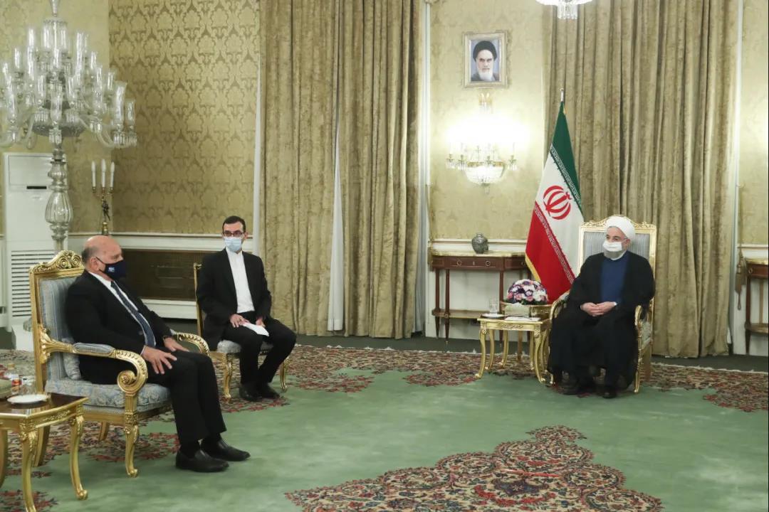 △伊朗總統(tǒng)魯哈尼(右)會晤伊拉克外長福阿德·侯賽因(左)