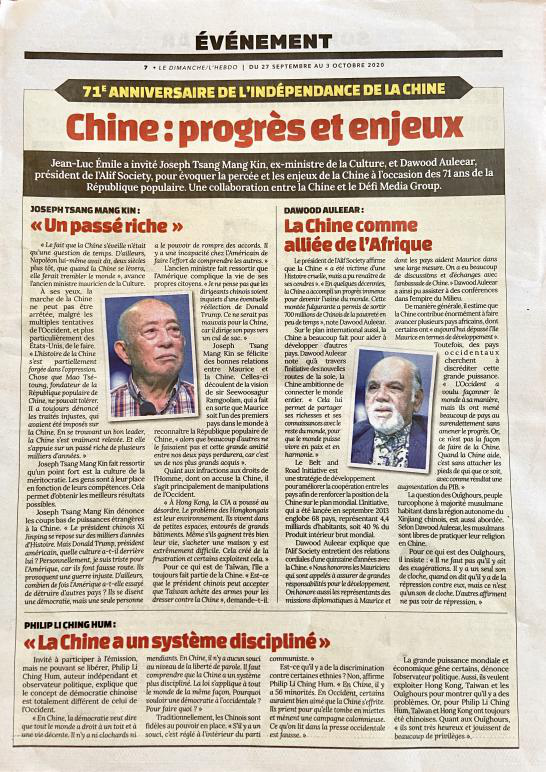 在中華人民共和國成立71周年之際,毛里求斯主流媒體《挑戰(zhàn)報》推出中國專題報道,通過旗下報紙、電臺、網(wǎng)絡(luò)、社交媒體等多個平臺,圍繞中國國家治理、經(jīng)濟發(fā)展、抗擊疫情等議題,采訪了中、毛相關(guān)領(lǐng)域知名人士。