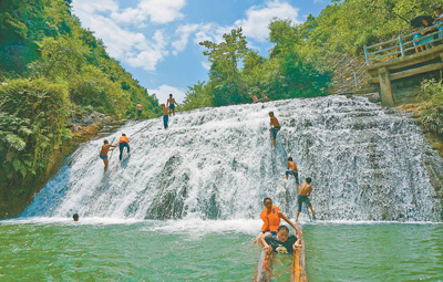 游客在鳳凰縣菖蒲塘村飛水谷景區(qū)瀑布游玩。攝于2014年8月。