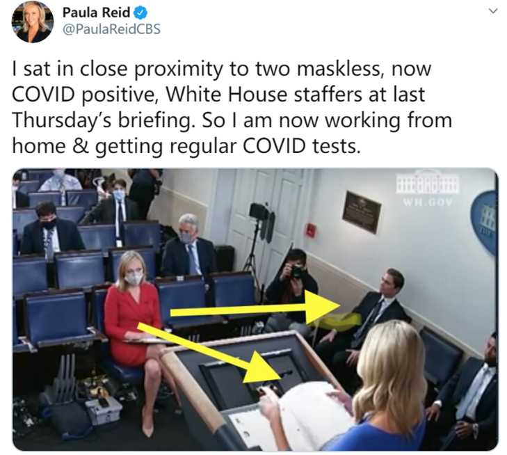 在得知麥肯尼確診后,CBS新聞?dòng)浾弑@だ锏拢≒aula Reid)默默地發(fā)了一條推文,稱自己在上周四(1日)的發(fā)布會(huì)上就坐在麥肯尼對(duì)面,且左手邊還有一名未戴口罩的工作人員。現(xiàn)在她已經(jīng)主動(dòng)在家隔離,并定期接受病毒檢測(cè)。