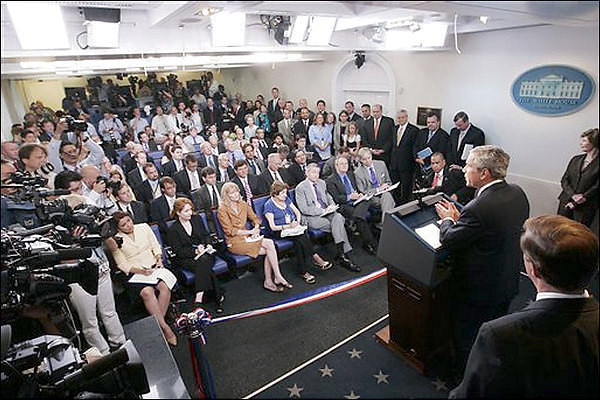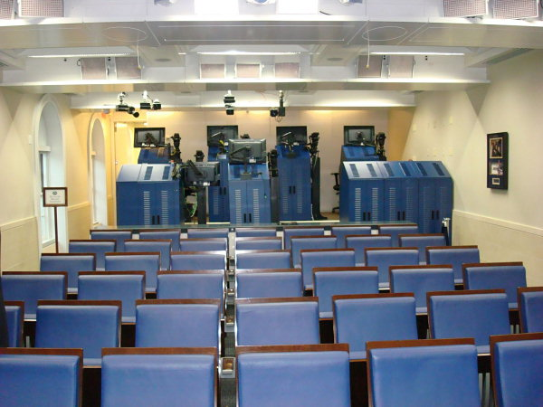 △狹窄擁擠的白宮新聞簡(jiǎn)報(bào)室 資料圖片來(lái)自白宮博物館
