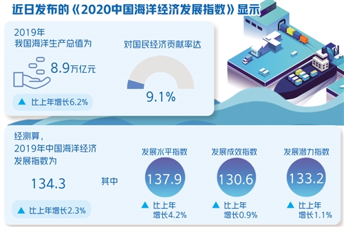 國家海洋信息中心近日發(fā)布的中國海洋經(jīng)濟發(fā)展指數(shù)顯示,我國海洋經(jīng)濟規(guī)模持續(xù)擴大,2019年海洋生產總值為8.9萬億元,比上年增長6.2%,對國民經(jīng)濟貢獻率達9.1%。