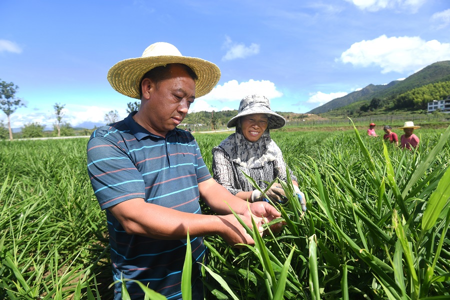 △2020年9月17日,汝城縣文明瑤族鄉(xiāng)沙洲現(xiàn)代農(nóng)旅示范基地,農(nóng)戶在查看小黃姜的生長(zhǎng)情況。
