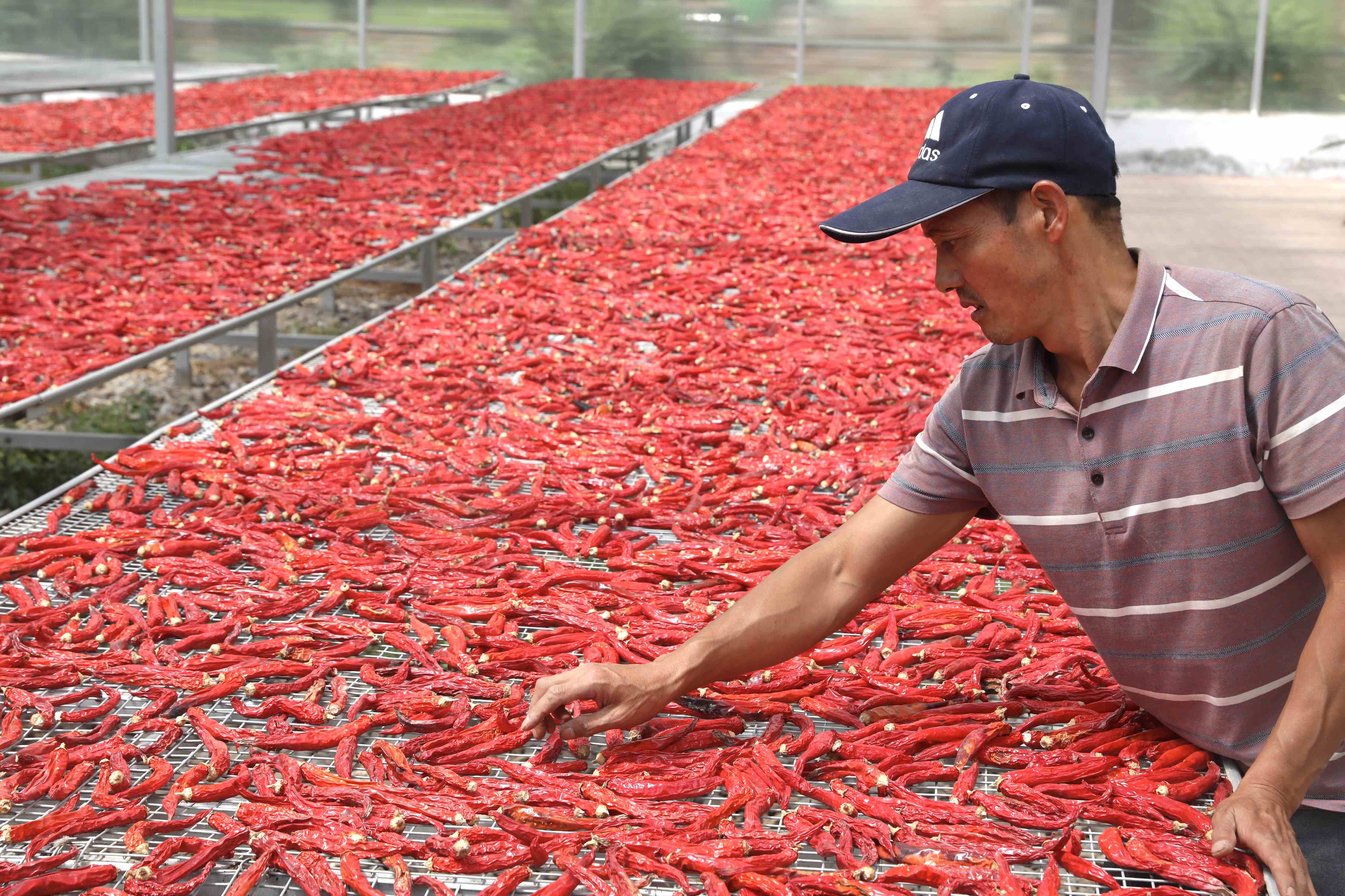 △甘肅省隴南市西和縣,地處秦巴山區(qū),是全國(guó)52個(gè)未摘帽貧困縣之一。近年來(lái),西和縣因地制宜構(gòu)建產(chǎn)業(yè)體系,向最后的貧困堡壘發(fā)起總攻。圖為2020年9月4日,西和縣理紅種植養(yǎng)殖農(nóng)民專業(yè)合作社的辣椒種植基地里,社員在晾曬新一茬的紅辣椒。