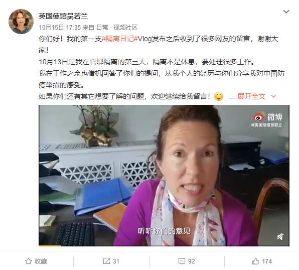 前不久,英國(guó)新任駐華大使吳若蘭(Caroline Wilson)抵達(dá)北京開始任期,12日,她在自己的個(gè)人微博上發(fā)布消息說,回到了官邸開始為期14天的隔離。隔離期間,她用中文錄制了隔離日記Vlog,大贊中國(guó)的防疫措施和衛(wèi)生人員專業(yè)。