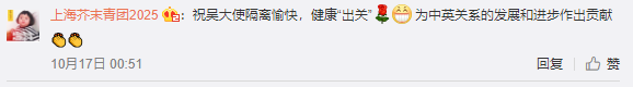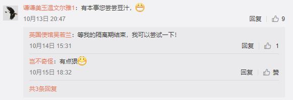 她也在微博留言欄跟網(wǎng)友互動(dòng),表示自己會(huì)努力學(xué)好普通話,準(zhǔn)備等隔離結(jié)束嘗試北京小吃“豆汁”。
