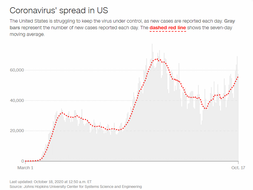 美國(guó)有線電視新聞網(wǎng)(CNN)10月18日?qǐng)?bào)道稱,16日,美國(guó)新增至少6.9萬(wàn)例新冠肺炎確診病例,這是自7月以來(lái)單日新增病例最多的一天。專家稱,這標(biāo)志著美國(guó)秋冬季疫情開(kāi)始暴發(fā)。