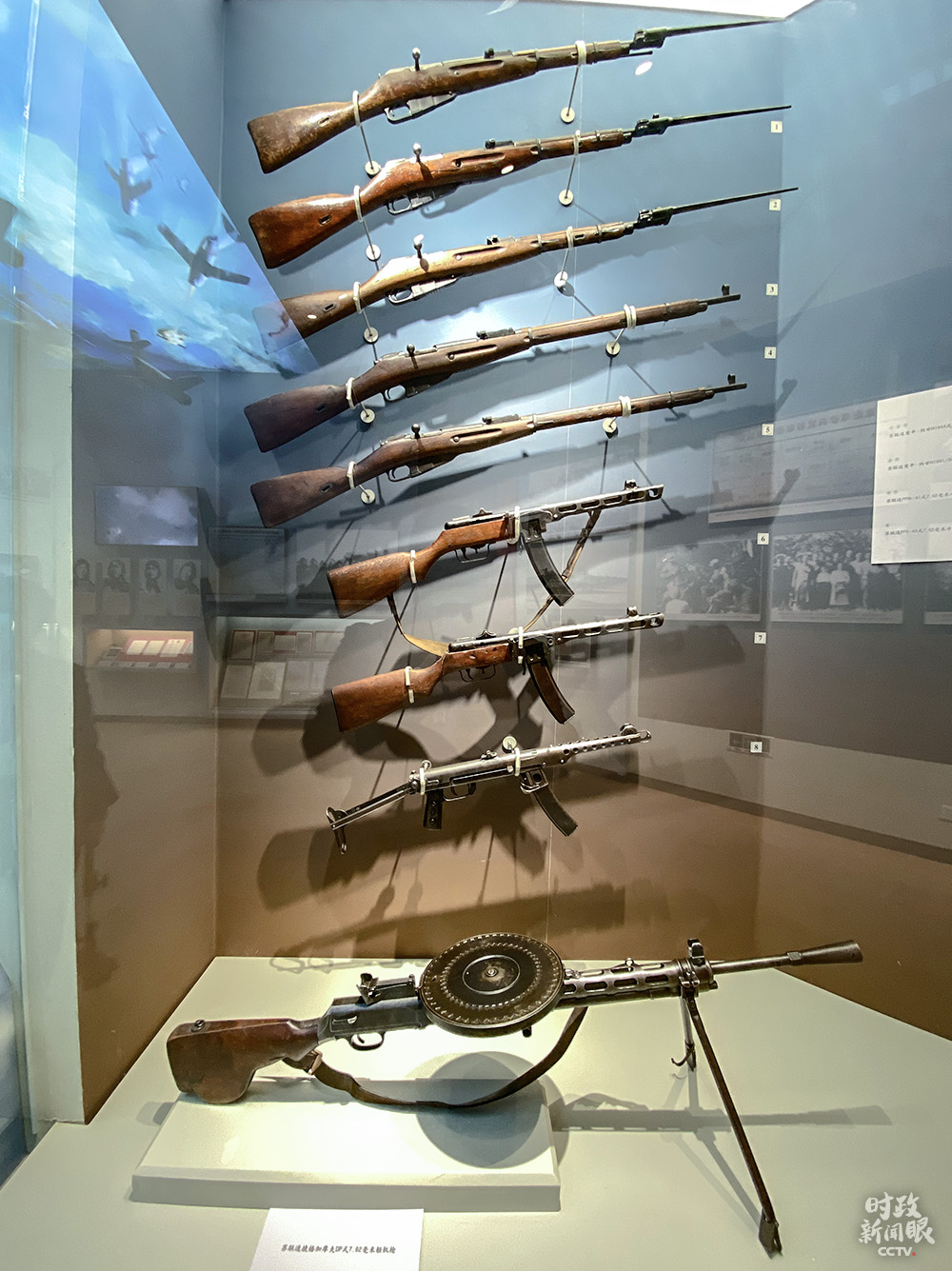 △圖中最下面是捷格加廖夫輕機(jī)槍,彈盤裝彈數(shù)量多?姑涝瘧(zhàn)場上,志愿軍曾使用過這種火力兇猛的蘇式機(jī)槍。(總臺央視記者李輝拍攝)