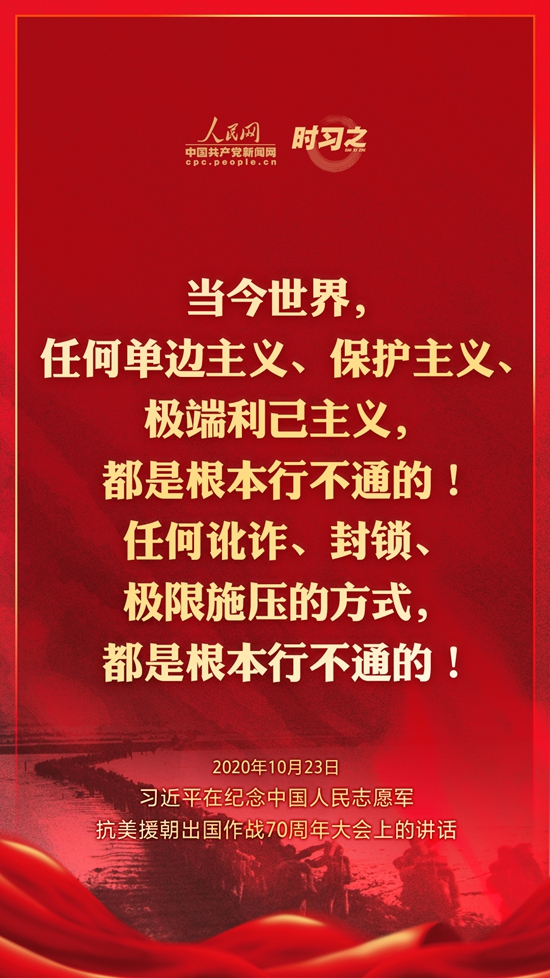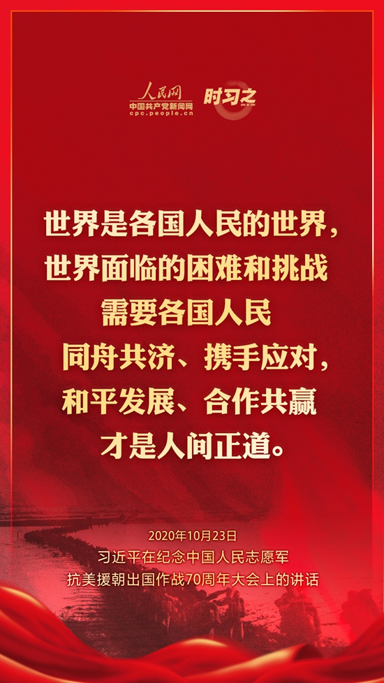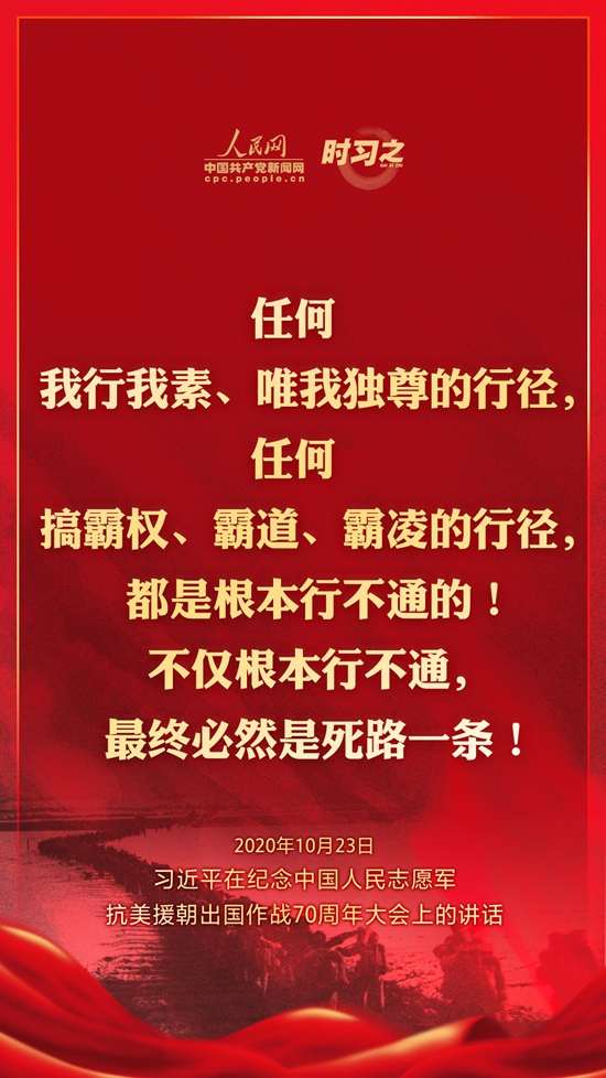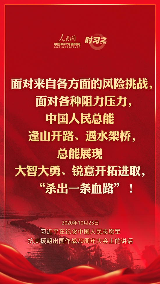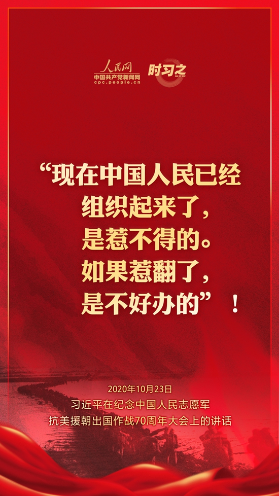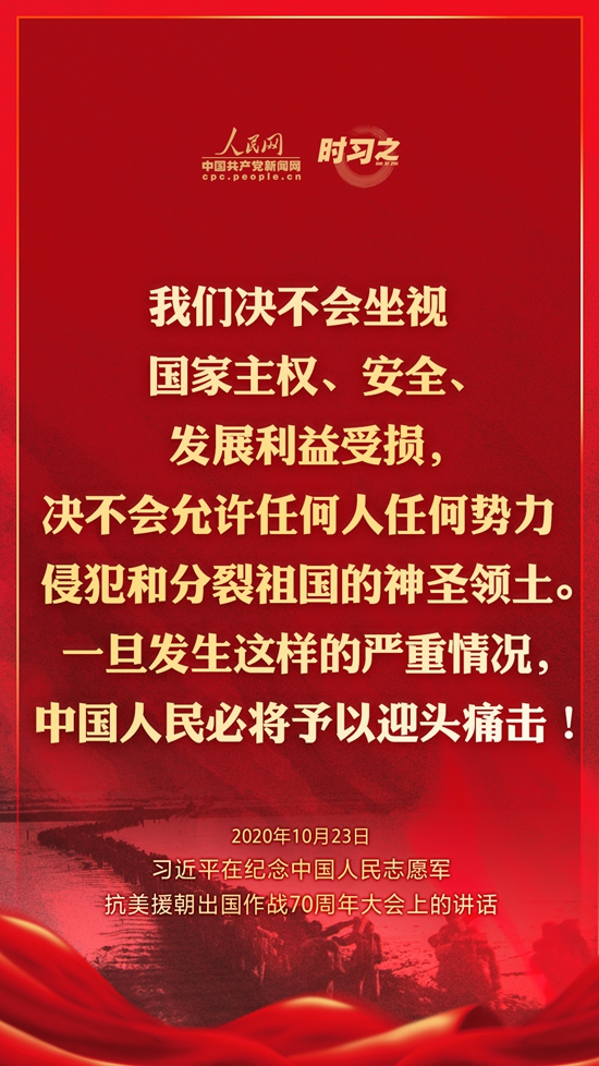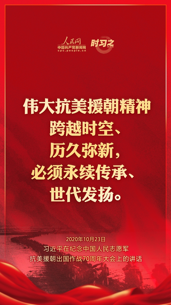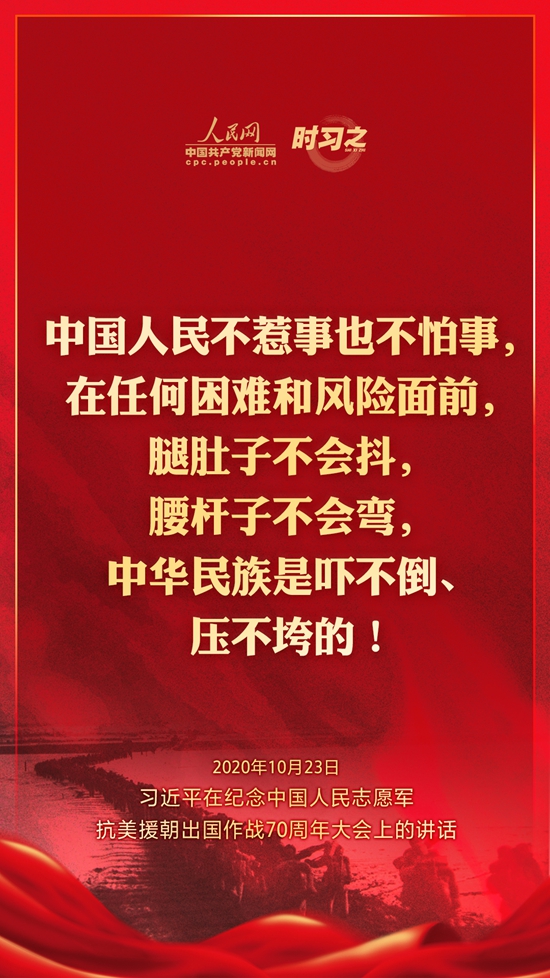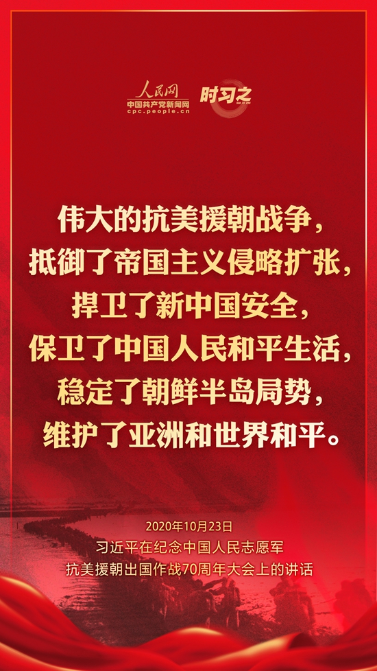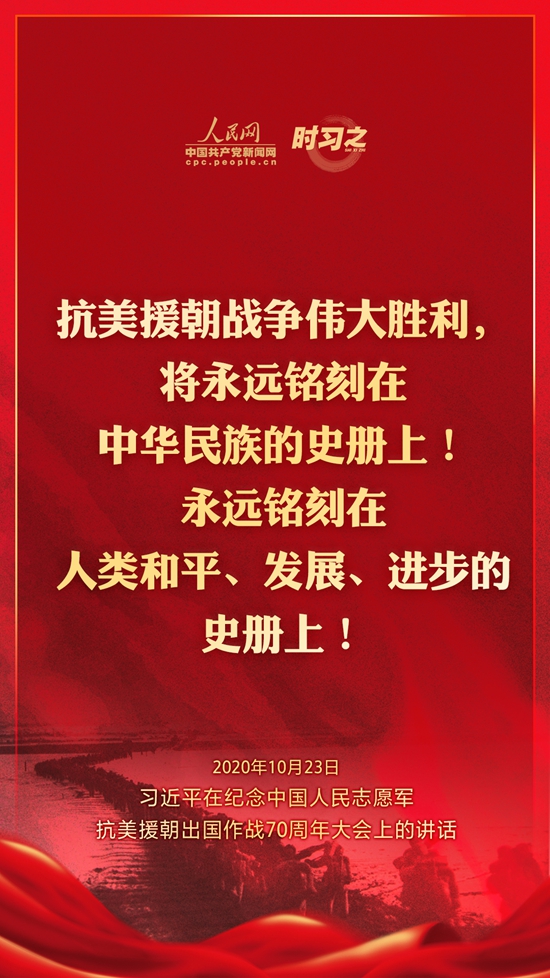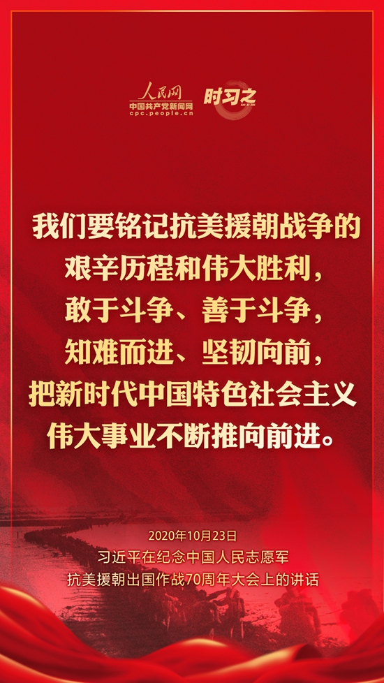 10月23日上午10時(shí),紀(jì)念中國人民志愿軍抗美援朝出國作戰(zhàn)70周年大會(huì)在北京人民大會(huì)堂隆重舉行。中共中央總書記、國家主席、中央軍委主席習(xí)近平出席大會(huì)并發(fā)表重要講話。在講話中,習(xí)近平總書記全面回顧總結(jié)了抗美援朝戰(zhàn)爭的偉大勝利和巨大貢獻(xiàn),深刻闡述了抗美援朝精神的歷史意義和時(shí)代價(jià)值,精辟揭示了抗美援朝戰(zhàn)爭的歷史啟示,鄭重宣示了捍衛(wèi)國家領(lǐng)土主權(quán)和統(tǒng)一、維護(hù)地區(qū)和世界和平穩(wěn)定、推動(dòng)構(gòu)建人類命運(yùn)共同體的堅(jiān)定立場和決心,強(qiáng)調(diào)要銘記偉大勝利,敢于斗爭、善于斗爭,把中國特色社會(huì)主義偉大事業(yè)不斷推向前進(jìn)。人民網(wǎng)·中國共產(chǎn)黨新聞網(wǎng)“時(shí)習(xí)之”欄目制作了12張海報(bào),帶您一起回顧總書記鏗鏘有力的話語。