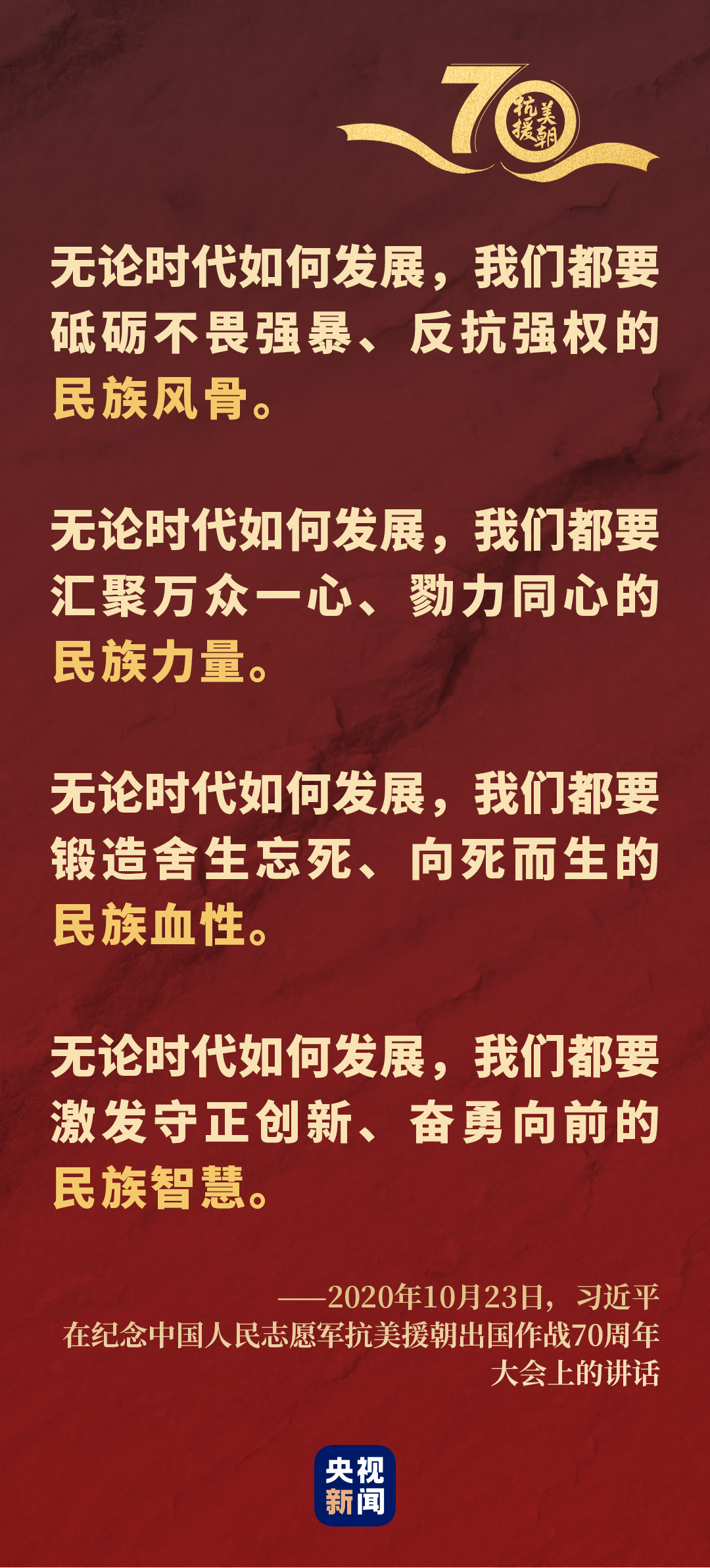 “偉大抗美援朝精神跨越時(shí)空、歷久彌新,必須永續(xù)傳承、世代發(fā)揚(yáng)。”10月23日,在紀(jì)念中國(guó)人民志愿軍抗美援朝出國(guó)作戰(zhàn)70周年大會(huì)上,習(xí)近平這樣闡述。