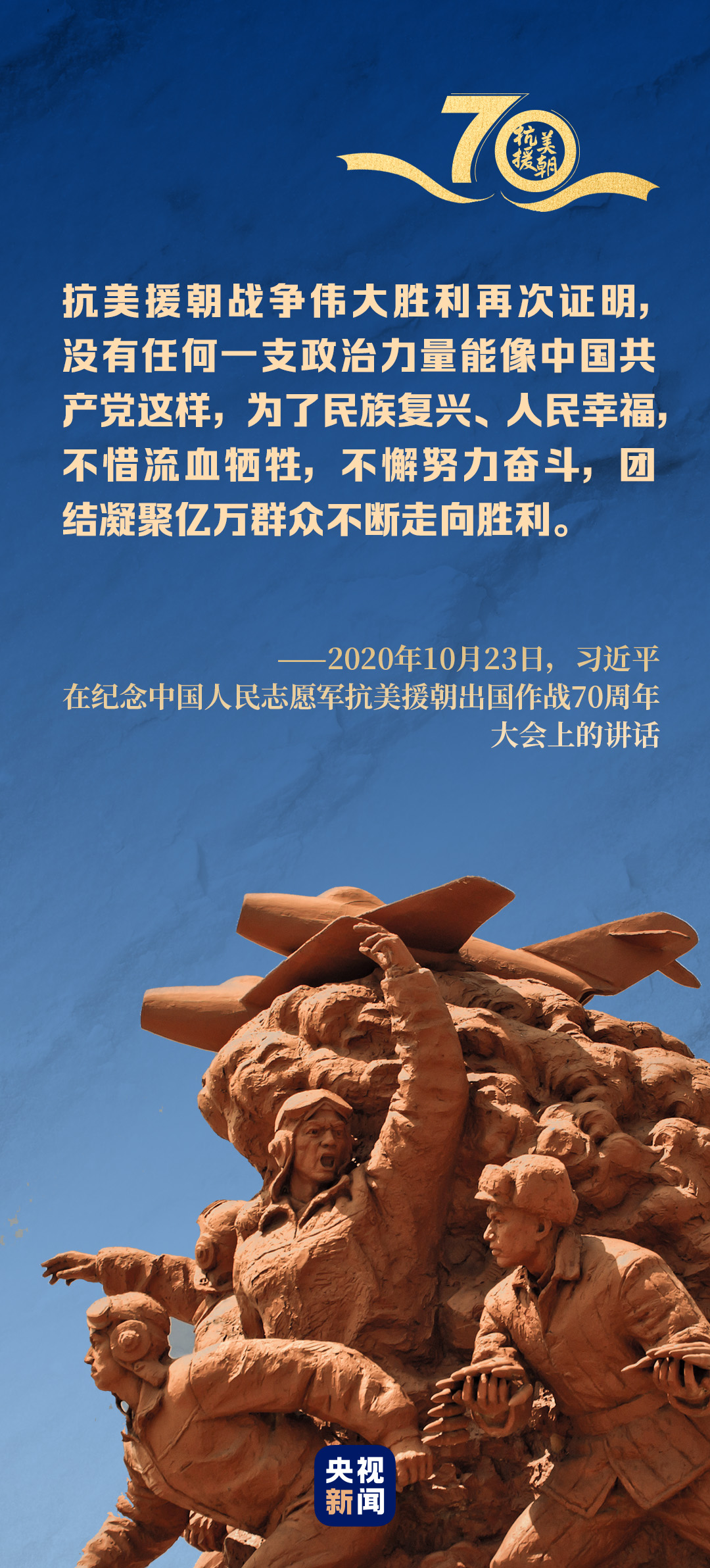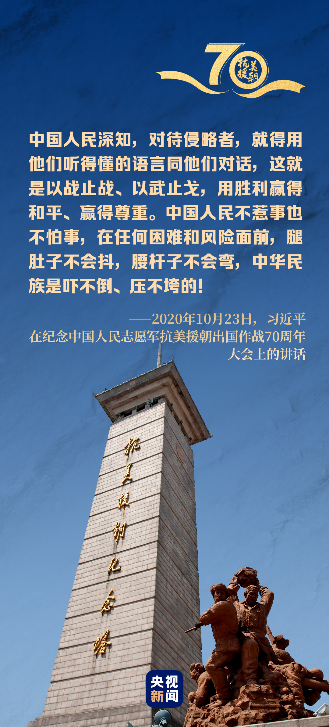 “1950年10月19日,中國(guó)人民志愿軍在彭德懷司令員兼政治委員率領(lǐng)下進(jìn)入朝鮮戰(zhàn)場(chǎng)。這是以正義之師行正義之舉!薄皞ゴ蟮目姑涝瘧(zhàn)爭(zhēng),抵御了帝國(guó)主義侵略擴(kuò)張,捍衛(wèi)了新中國(guó)安全,保衛(wèi)了中國(guó)人民和平生活,穩(wěn)定了朝鮮半島局勢(shì),維護(hù)了亞洲和世界和平!痹谥v話中,習(xí)近平充分肯定中國(guó)人民志愿軍建立的不朽歷史功勛。