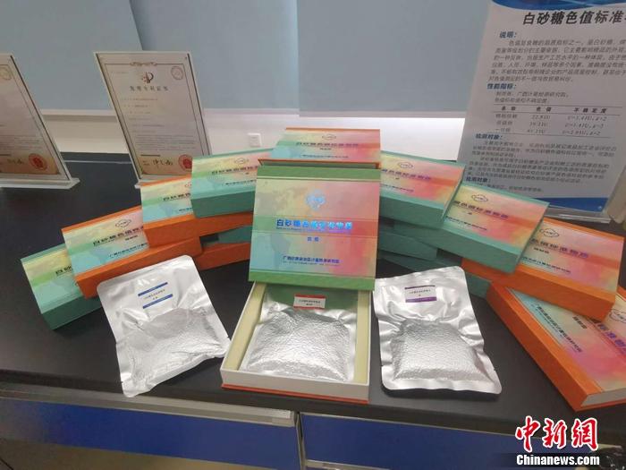圖為廣西計(jì)量院陳列的白砂糖色值標(biāo)準(zhǔn)物質(zhì)。中新網(wǎng)記者 謝藝觀 攝