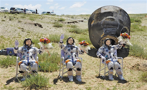 圖為圓滿完成神舟九號交會對接任務的航天員安全返回地面。秦憲安攝(中經視覺)