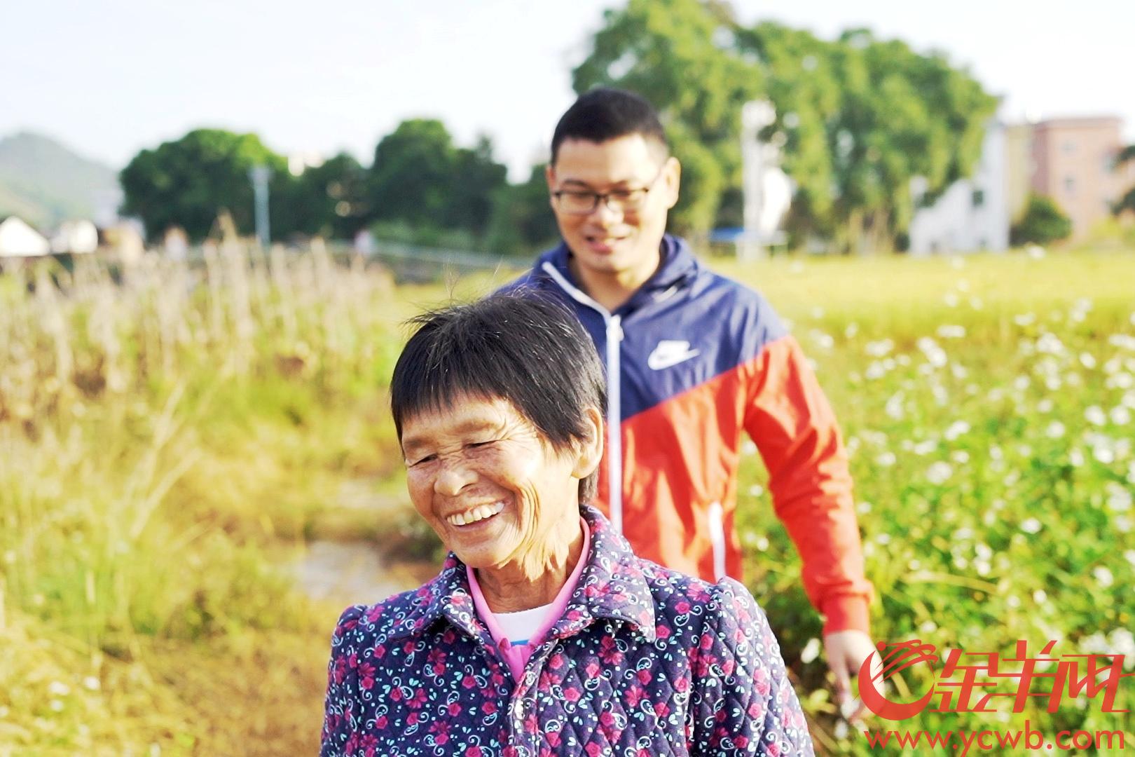 連州市聯(lián)一村第一書記劉龍騰與村民黃玉美走在田間小路上