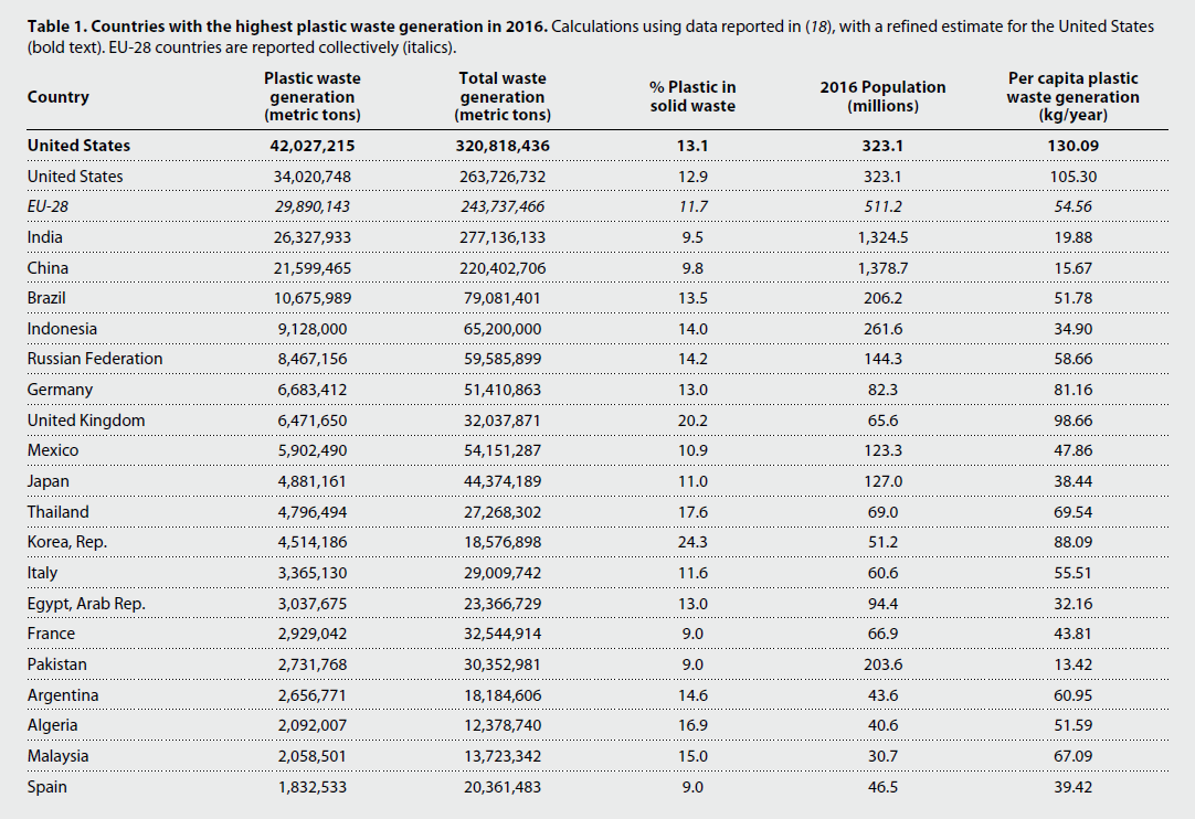 △2016年部分國(guó)家塑料垃圾的產(chǎn)量,粗體部分為對(duì)美國(guó)的產(chǎn)量進(jìn)行了更加精確的估算,其余均引用世界銀行的數(shù)據(jù)。注:歐盟為28個(gè)國(guó)家的產(chǎn)量總和 (圖片來源:《科學(xué)進(jìn)展》)