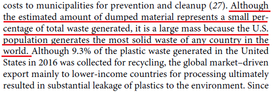 這篇報(bào)告名為《美國(guó)塑料垃圾對(duì)大陸和海洋的影響》,其中指出,經(jīng)過研究團(tuán)隊(duì)精確統(tǒng)計(jì),2016年美國(guó)生產(chǎn)了4200噸的塑料垃圾。不僅如此,不論是根據(jù)此前世界銀行公布的結(jié)果,還是研究組的統(tǒng)計(jì)數(shù)據(jù),美國(guó)都是2016年生產(chǎn)塑料垃圾最多的國(guó)家,也是唯一人均塑料垃圾生產(chǎn)量超過100公斤的國(guó)家。