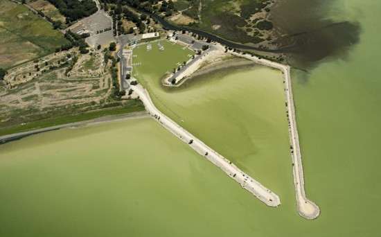 △2016年7月,美國(guó)猶他湖藍(lán)藻覆蓋湖面