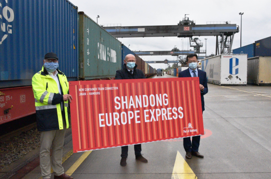 △馬特恩(左)2020年4月30日在漢堡港貨運(yùn)場(chǎng)站與中國(guó)駐漢堡總領(lǐng)事杜曉暉、漢堡市經(jīng)濟(jì)部長(zhǎng)韋斯特哈格曼共同迎接首趟濟(jì)南至德國(guó)漢堡中歐班列的抵達(dá)(來(lái)源:漢堡港營(yíng)銷協(xié)會(huì))