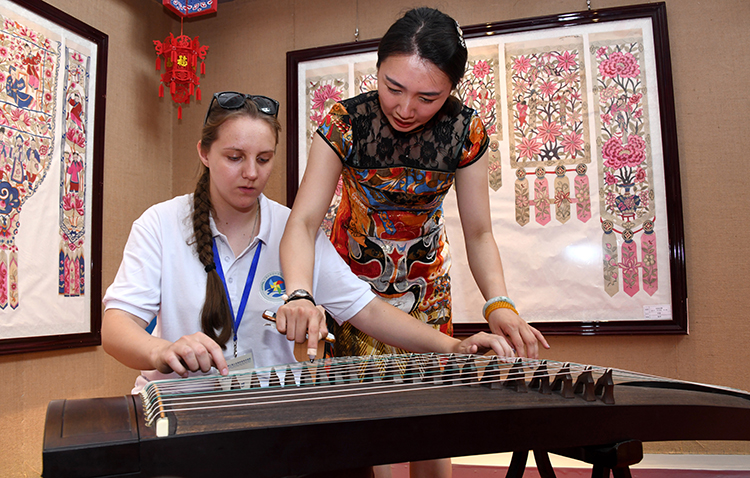 2018年7月17日,第三屆上海合作組織青年交流營(yíng)的營(yíng)員在青島參加了一場(chǎng)別開(kāi)生面的民俗互動(dòng)體驗(yàn)活動(dòng),感受中國(guó)傳統(tǒng)文化。這是來(lái)自哈薩克斯坦的薩莎(左)在學(xué)習(xí)古箏彈奏。
