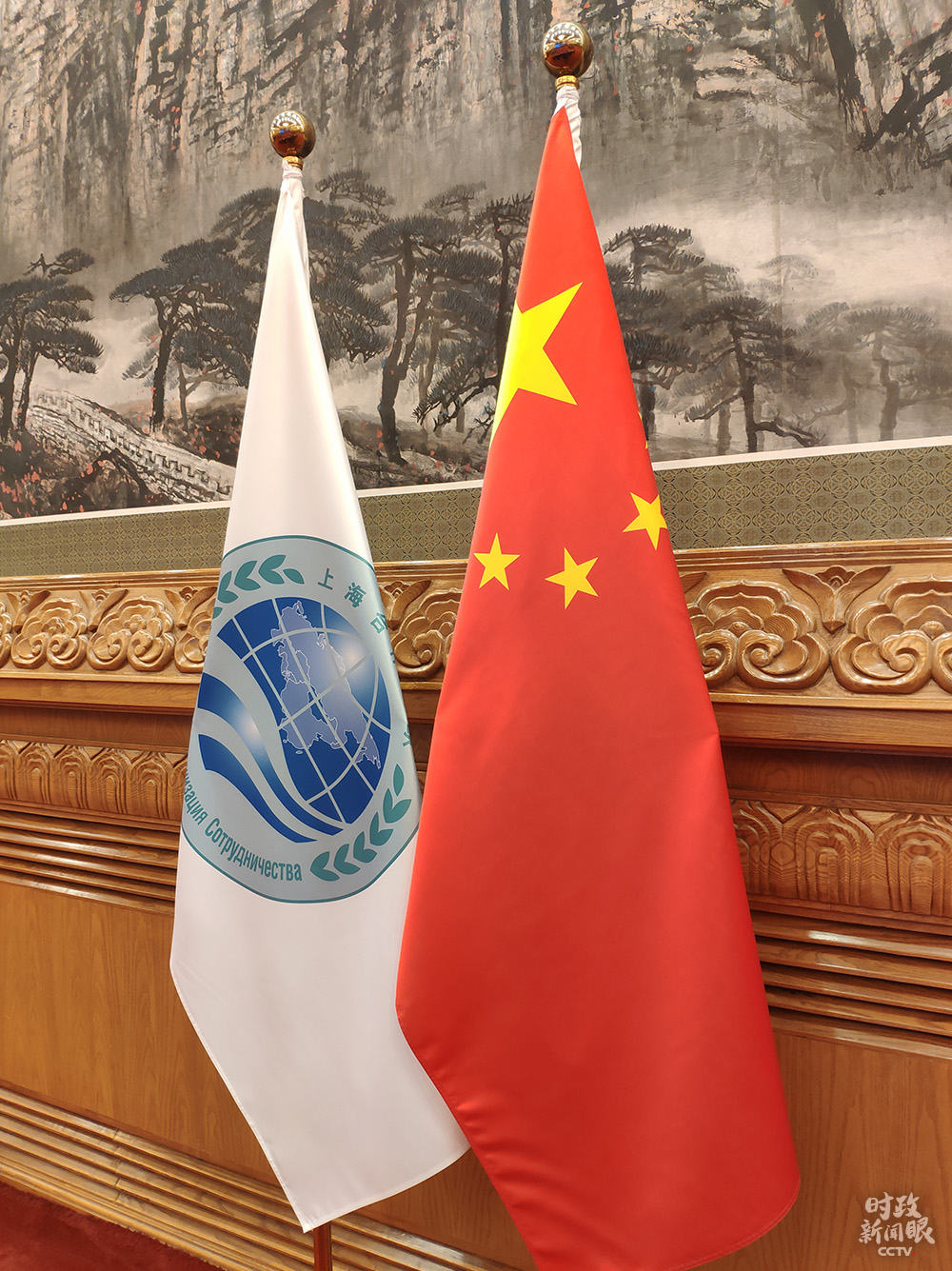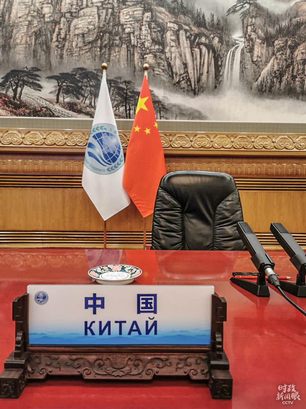 △會場內(nèi)擺放的中國國旗和上海合作組織旗幟(總臺央視記者耿小龍拍攝)