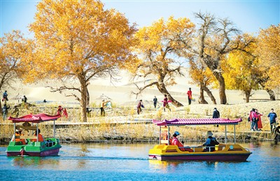 10月21日,在新疆維吾爾自治區(qū)巴音郭楞蒙古自治州尉犁縣羅布人村寨景區(qū),游客乘坐觀光船游覽河岸胡楊。