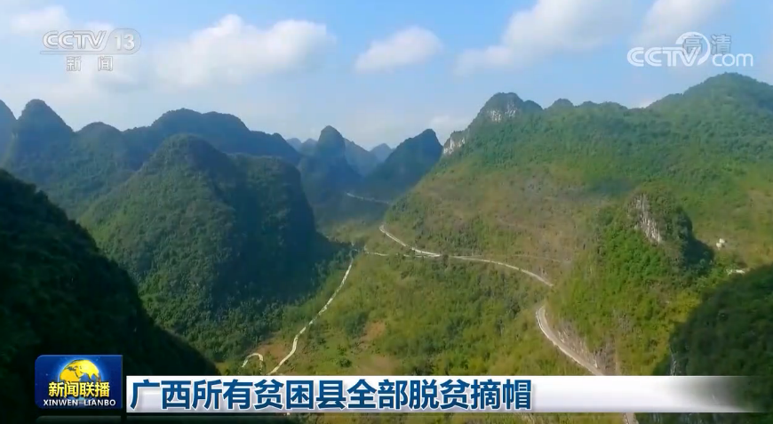 央視網(wǎng)消息(新聞聯(lián)播):今天(11月20日),廣西壯族自治區(qū)宣布最后8個(gè)貧困縣摘帽,區(qū)內(nèi)所有貧困縣全部脫貧摘帽。