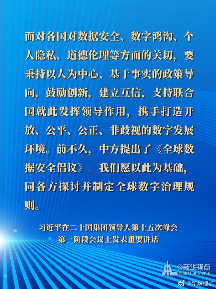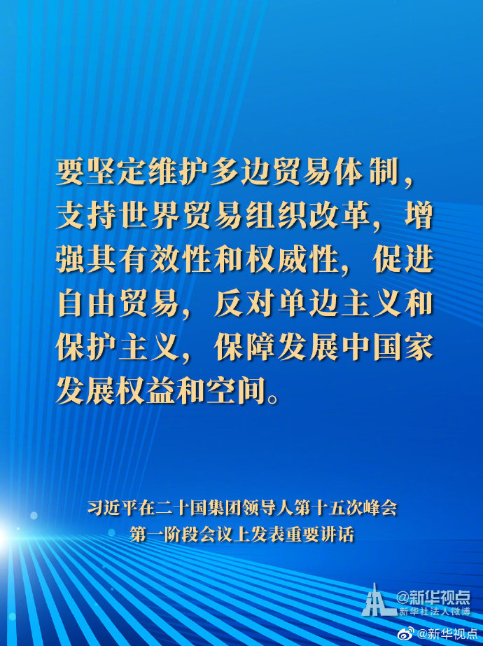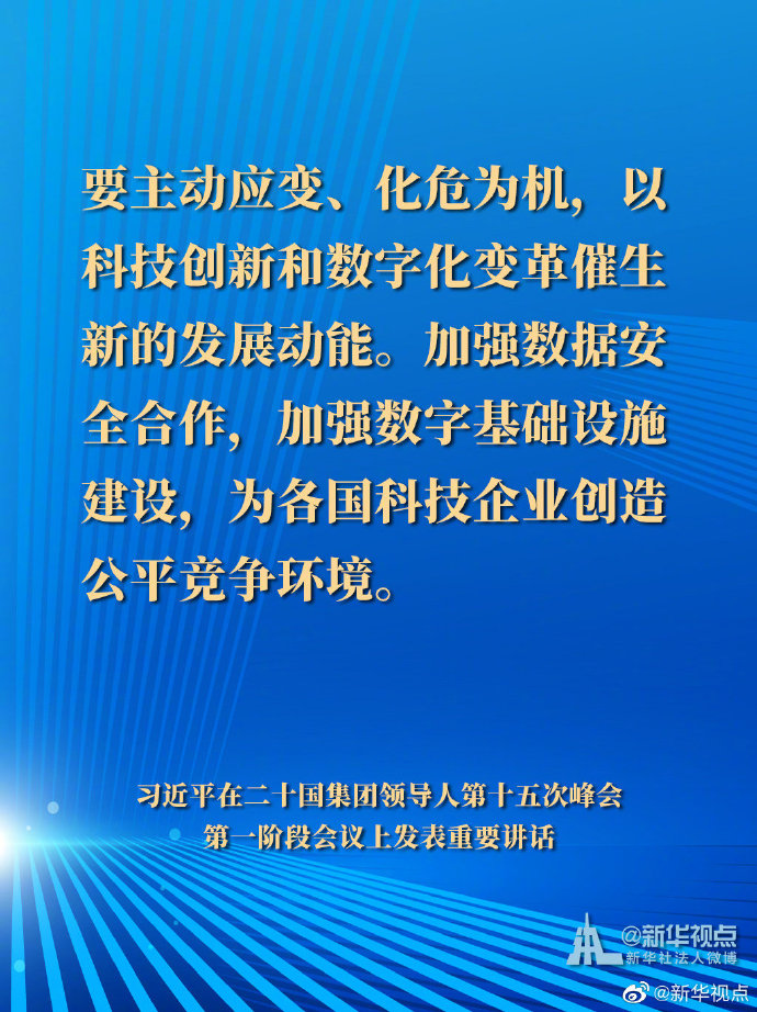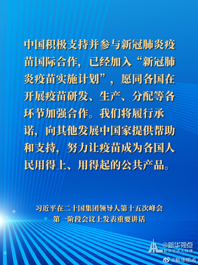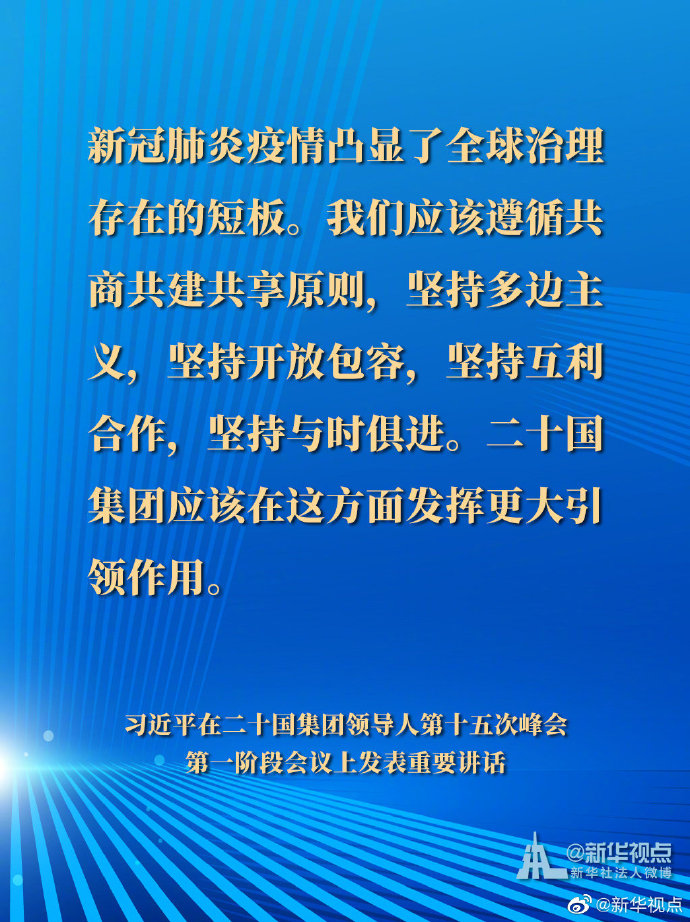 國家主席習(xí)近平21日晚在北京以視頻方式出席二十國集團(tuán)領(lǐng)導(dǎo)人第十五次峰會第一階段會議并發(fā)表重要講話。以下是講話要點(diǎn)。