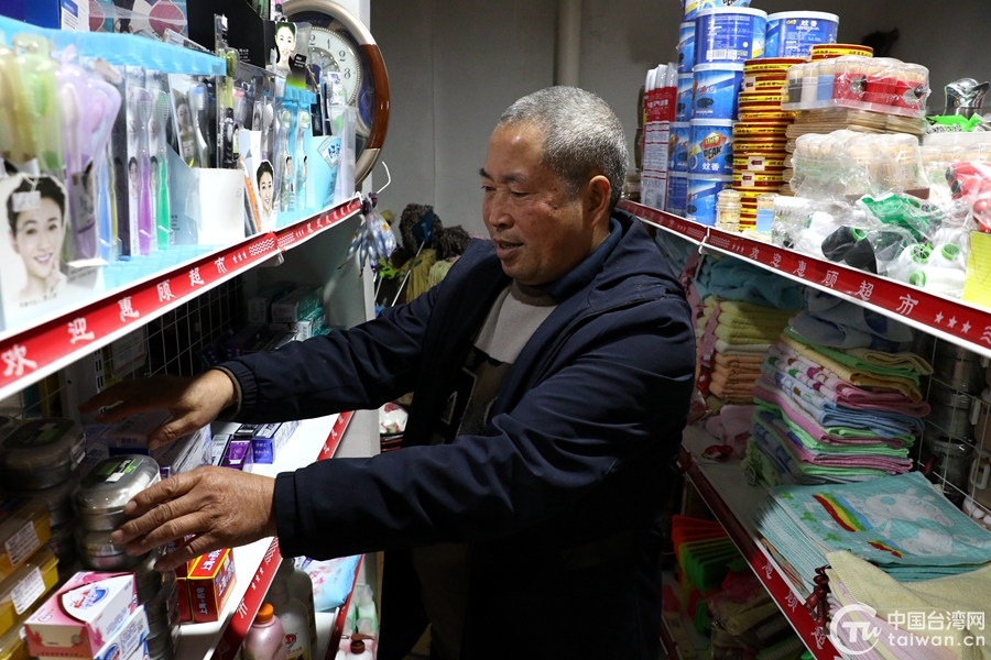 村民安景緒在店內(nèi)整理貨物。(中國臺灣網(wǎng) 尹賽楠 攝)