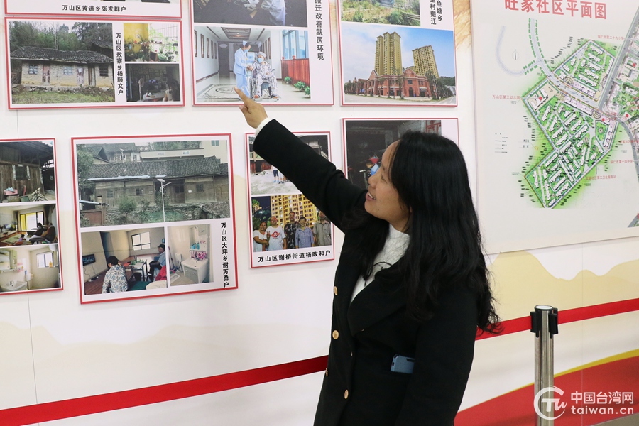 旺家社區(qū)黨總支部副書記何英向記者介紹萬山區(qū)易地扶貧搬遷后,當(dāng)?shù)卮迕窬幼l件的變化。(中國臺灣網(wǎng) 尹賽楠 攝)