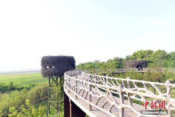 候鳥(niǎo)小鎮(zhèn)的觀鳥(niǎo)臺(tái)設(shè)計(jì)采用仿生學(xué)原理,建造了鳥(niǎo)巢、鳥(niǎo)蛋、梧桐樹(shù)等造型觀鳥(niǎo)點(diǎn)。建筑材料就地取材,利用舊磚、舊瓦等,減少環(huán)境破壞與污染。圖為永修縣吳城鎮(zhèn)候鳥(niǎo)小鎮(zhèn)觀鳥(niǎo)點(diǎn)。 江西九江永修縣委宣傳部供圖