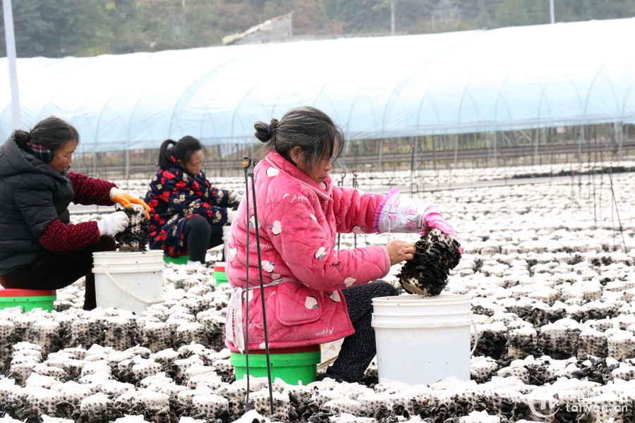 馬腦村村民李淑霞正在進行木耳采摘。(中國臺灣網(wǎng) 尹賽楠 攝)