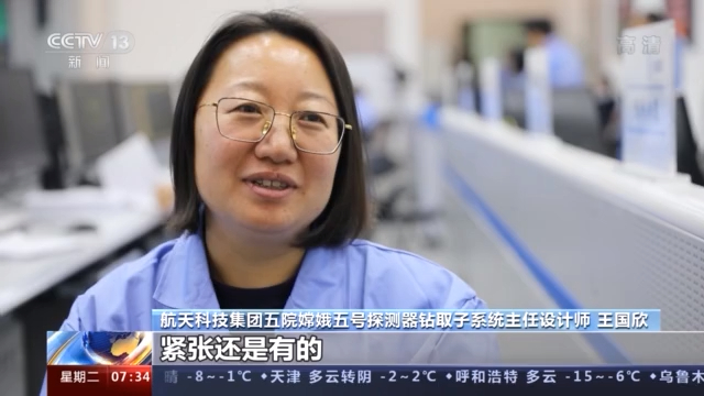 航天科技集團(tuán)五院嫦娥五號探測器鉆取子系統(tǒng)主任設(shè)計師 王國欣:說不緊張,其實是不想緊張。緊張還是有的,因為這個畢竟是我們這么多年的一個成果,今天是我們十幾年以來的唯一的一次檢驗機(jī)會。我們之前按照我們在軌工作狀態(tài),提出了五十多種預(yù)案,今天只是用到其中一兩個,其實用得還是比較少的。