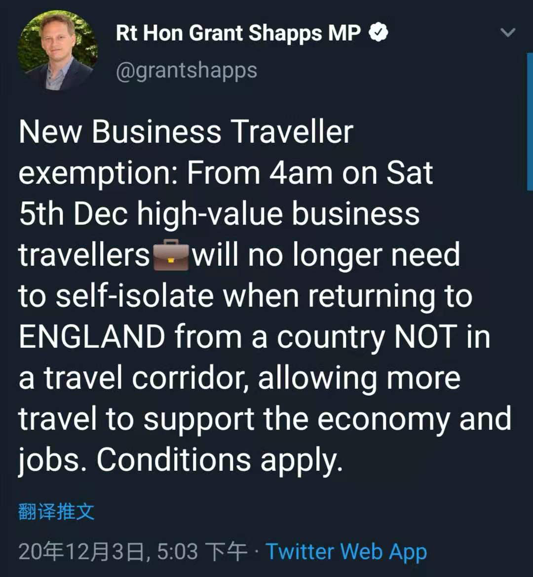 12月3日,英國交通部長在推特上發(fā)布稱“從12月5日凌晨4點開始,如果你是為英國經濟帶來巨大貢獻的商務人士,就算不是來自豁免國家,到達英國也不再需要隔離(14天),這是為了我們的經濟和就業(yè)”。