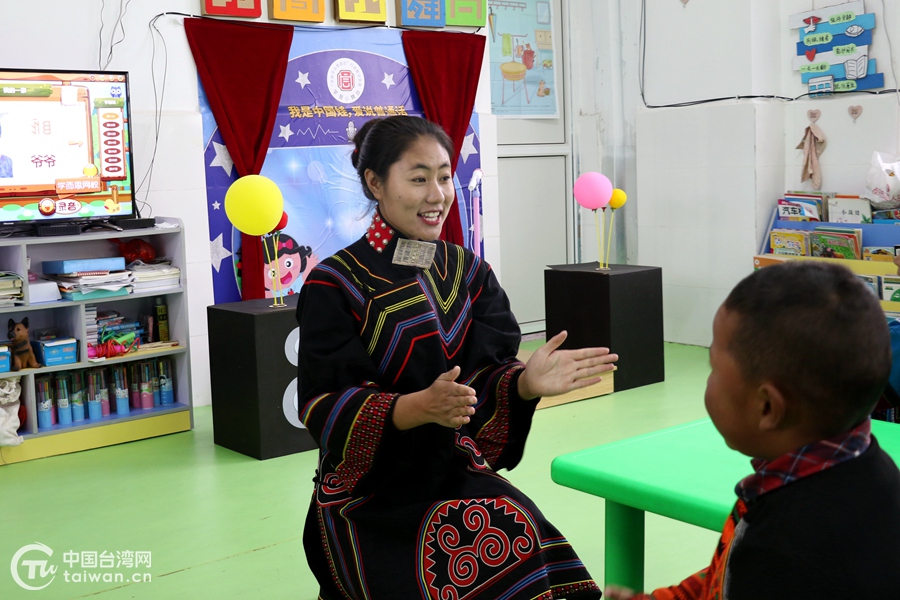 灑拉地坡鄉(xiāng)幼兒園教師羅英與孩子們互動(dòng)。(中國臺(tái)灣網(wǎng) 尹賽楠 攝)