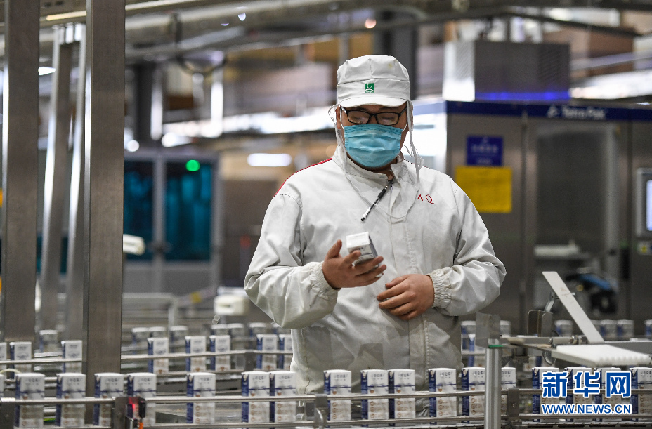 3月19日,技術(shù)人員在呼和浩特市蒙牛圣牧高科乳品有限公司的生產(chǎn)車間內(nèi)檢查產(chǎn)品的包裝情況。新華社記者 彭源 攝