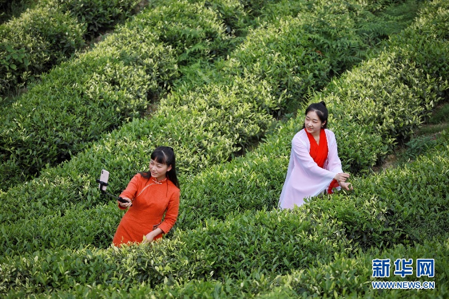 4月30日,網(wǎng)絡(luò)主播毛華艷(右)在貴州省余慶縣白泥鎮(zhèn)春景村郊外的茶園直播,助推山區(qū)茶葉銷售。新華社記者 劉續(xù) 攝