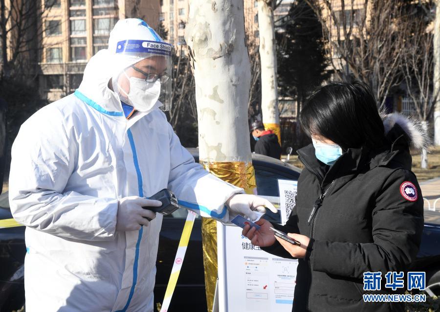 2021年1月3日,在北京市順義區(qū)雙豐街道香悅西區(qū)采樣點(diǎn),工作人員(左)通過取碼終端將生成的紙質(zhì)核酸檢測預(yù)約碼交給被檢測人員。