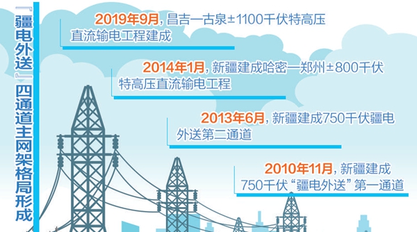 2010年,“疆電外送”的序幕緩緩拉開。當(dāng)年11月,新疆建成“疆電外送”第一通道——哈密至敦煌750千伏輸變電工程,實(shí)現(xiàn)了新疆并入全國電網(wǎng);2013年6月,750千伏第二通道建成投運(yùn);2014年1月,哈密—鄭州±800千伏特高壓直流輸電工程投運(yùn),“疆電外送”第三通道建成。
