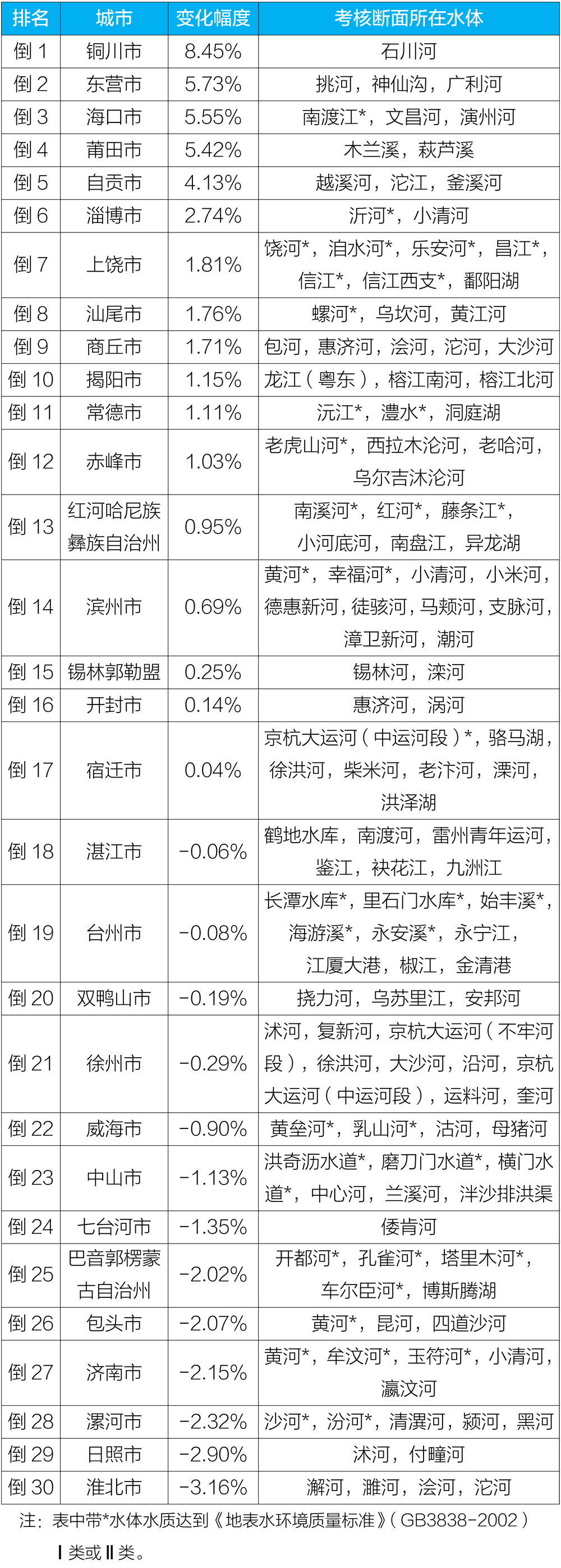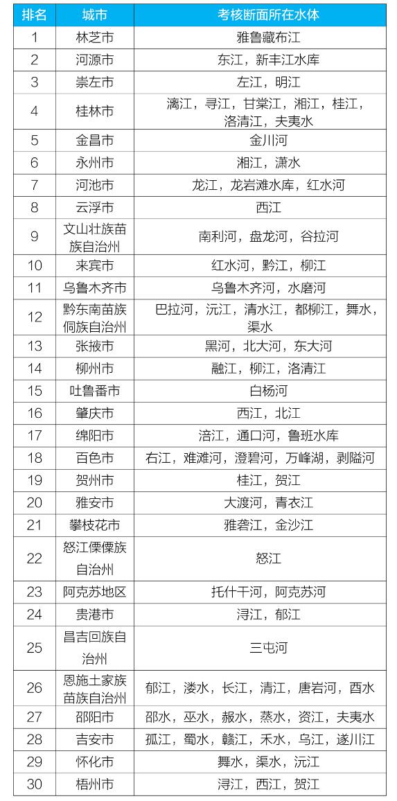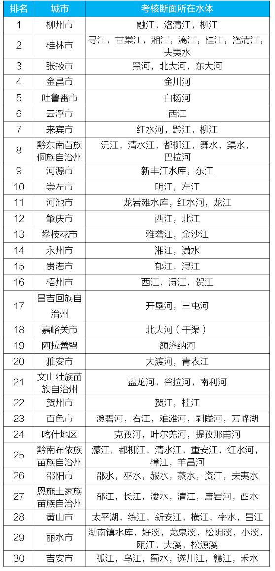 地級及以上城市國家地表水考核斷面排名如下: